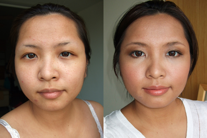 左邊是素顏,右邊上了底妝(但是還沒擦脣膏)